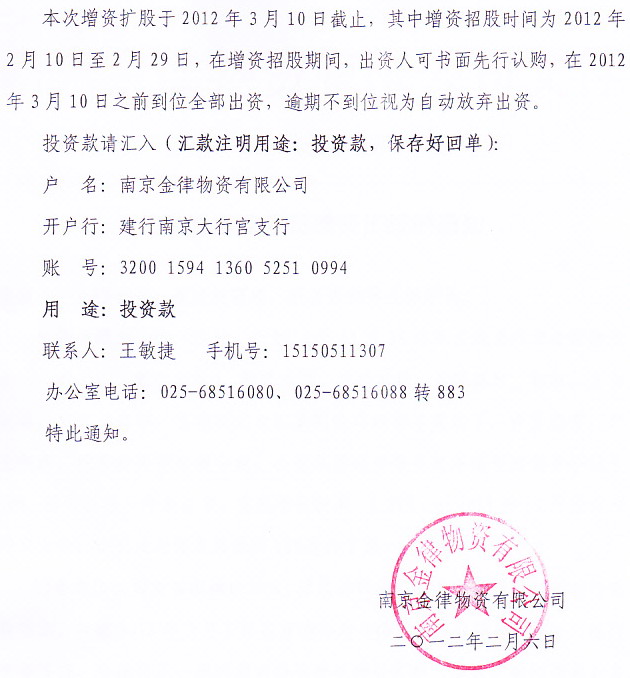 關(guān)于對(duì)金律公司增資擴(kuò)股的通知