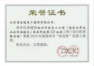 公司承建的揚州食品工業(yè)園項目榮獲2018年度揚州市優(yōu)質(zhì)工程獎“瓊花杯”